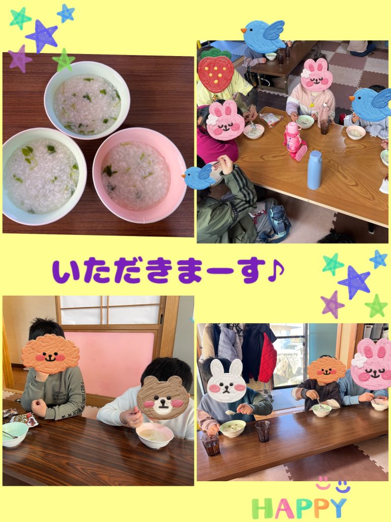 じゃーん✨完成しました。素朴な味が好みの子は「おいしい~😍」と言っておかわりしていました。初めて食べる子も一口頑張って食べていました。みんなで作った七草粥、あっという間に完食しました💚食べ終わってからも七草を覚えて歌っている子もしました🎵少しでも七草について知ってもらえたので良かったです。